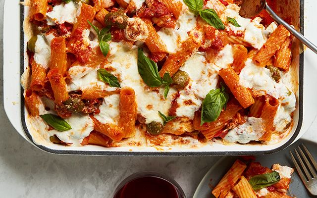 Ριγκατόνι στο φούρνο με κόκκινες πιπεριές και πράσινες ελιές