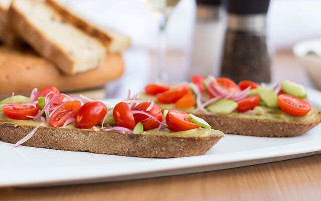 Μαύρο ψωμί με σπρέντ από αβοκάντο και ταχίνι ολικής αλέσεως, ντοματίνια & αγγούρι