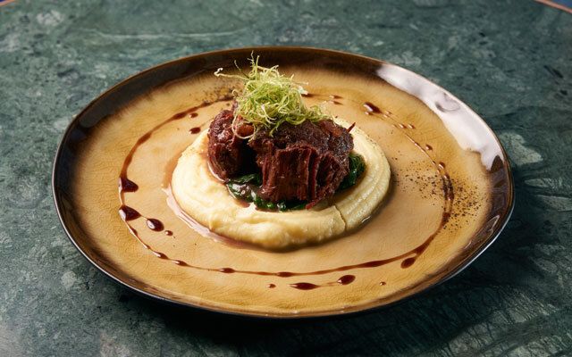 Μοσχαράκι στο φούρνο με σπανάκι και πουρέ αγκινάρας