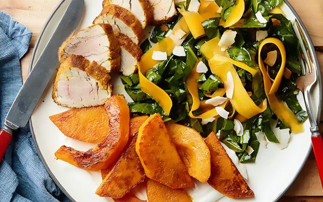 Χοιρινό φιλέτο με κουρκουμά, κολοκύθα & πράσινη σαλάτα