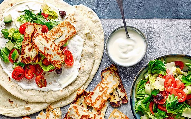 Χορταστικιές τορτίγιες με χαλούμι, δροσιστικό γιαούρτι και λαχανικά